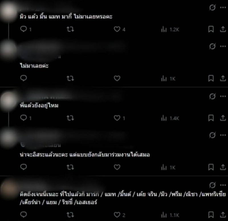 รวมถึง เต้ย จรินทร์พร , ณิชา ณัฏฐณิชา , แพทริเซีย กู๊ด , พรีม รณิดา และ แยม มทิรา ที่ต่างไม่ได้เข้าร่วมในช่วงหลังเช่นกัน