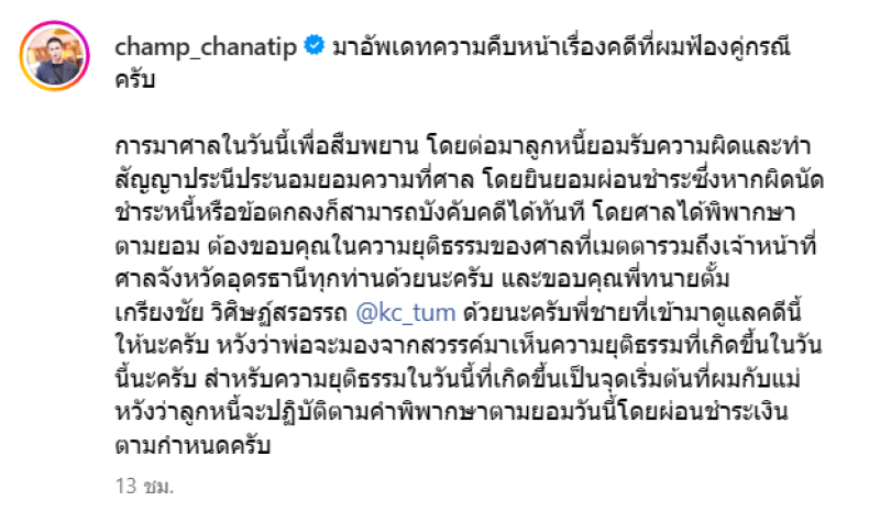 ล่าสุดความยุติธรรมมีจริง เมื่อทางหนุ่มแชมป์ ได้อัปเดตเกี่ยวกับคดีความในเรื่องนี้ว่า มาอัปเดตความคืบหน้าเรื่องคดีที่ผมฟ้องคู่กรณีครับ การมาศาลในวันนี้เพื่อสืบพยาน โดยต่อมาลูกหนี้ยอมรับความผิดและทำสัญญาประนีประนอมยอมความที่ศาล โดยยินยอมผ่อนชำระซึ่งหากผิดนัดชำระหนี้หรือข้อตกลงก็สามารถบังคับคดีได้ทันที โดยศาลได้พิพากษาตามยอม ต้องขอบคุณในความยุติธรรมของศาลที่เมตตารวมถึงเจ้าหน้าที่ศาลจังหวัดอุดรธานีทุกท่านด้วยนะครับ