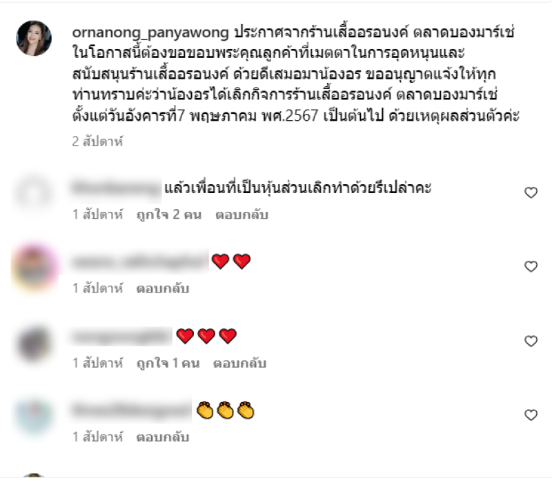 เรียกได้ว่า เป็นนางงามและนักแสดงรุ่นใหญ่ อย่าง อรอนงค์ ปัญญาวงศ์ และเจ้าตัวได้ออกมาเผยกลางรายการแฉ และเล่าถึงการที่เป็นโรคมะเร็งว่ามันน่ากลัวแค่ไหน เป็นแบบไม่รู้ตัวเลย ล่าสุดทาง อรอนงค์ ได้โพสต์ประกาศปิดกิจการส่วนตัว ผ่านทางไอจี โดยได้ระบุข้อความว่า ประกาศจากร้านเสื้ออรอนงค์ ตลาดบองมาร์เช่ ในโอกาสนี้ต้องขอขอบพระคุณลูกค้าที่เมตตาในการอุดหนุนและสนับสนุนร้านเสื้ออรอนงค์ ด้วยดีเสมอมาน้องอร ขออนุญาตแจ้งให้ทุกท่านทราบค่ะว่าน้องอรได้เลิกกิจการร้านเสื้ออรอนงค์ ตลาดบองมาร์เช่ ตั้งแต่วันอังคารที่7 พฤษภาคม พศ.2567 เป็นต้นไป ด้วยเหตุผลส่วนตัวค่ะ