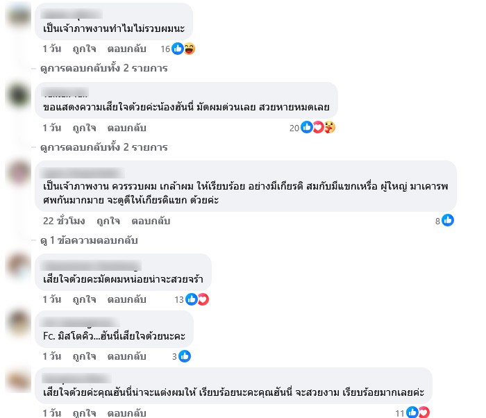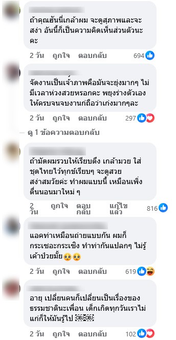 อาทิ ถ้าคุณฮันนี่เกล้าผม จะดูสุภาพและจะสง่า อันนี้ก็เป็นความคิดเห็นส่วนตัวนะคะ,ถ้ามัดผมรวบให้เรียบตึง เกล้ามวย ใส่ชุดไทยไว้ทุกข์เรียบๆ จะดูสวยสง่าสมวัยค่ะ ,เป็นเจ้าภาพงานทำไมไม่รวบผมนะ,เป็นเจ้าภาพงาน ควรรวบผม เกล้าผม ให้เรียบร้อย อย่างมีเกียรติ สมกับมีแขกเหรื่อ ผู้ใหญ่ มาเคารพศพกันมากมาย จะดูดีให้เกียรติแขก ด้วยค่ะ