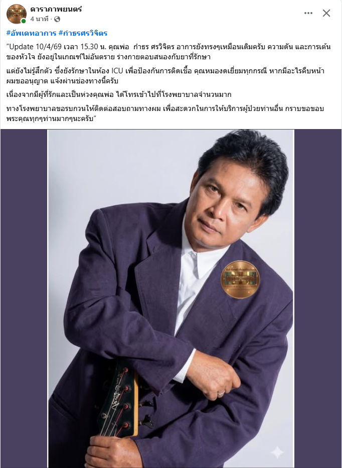 จากกรณีที่ก่อนหน้านั้น ได้มีข่าวว่า นักร้องรุ่นใหญ่ อย่าง กำธร ศรวิจิตร ล้มป่วย จนต้อง แอดมิทโรงพยาบาลด่วน ล่าสุด ทางเพจดัง อย่าง ดาราภาพยนตร์ ได้ออกมาเผยว่า #อัพเดทอาการ #กำธรศรวิจิตร ”Update 10/4/69 เวลา 15.30 น. คุณพ่อ กำธร ศรวิจิตร อาการยังทรงๆเหมือนเดิมครับ ความดัน และการเต้นของหัวใจ ยังอยู่ในเกณฑ์ไม่อันตราย ร่างกายตอบสนองกับยาที่รักษา