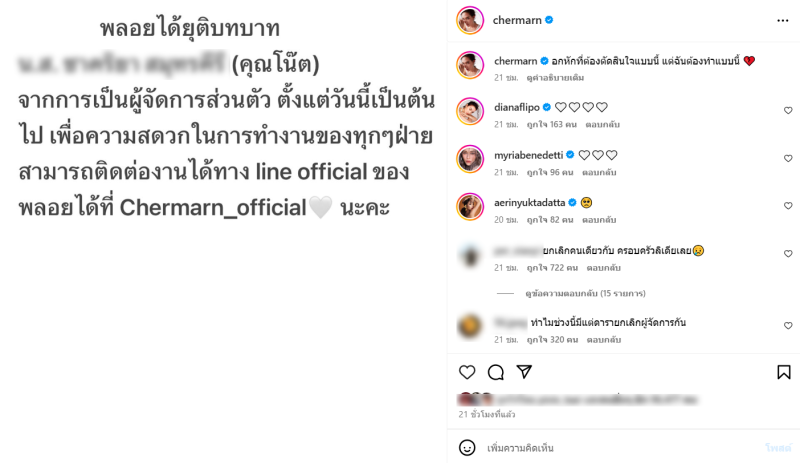และต่อมาก็คือ พลอย เฌอมาลย์ ได้ออกมาประกาศข่าวผ่านทางอินสตาแกรม โดยได้ระบุข้อความว่า พลอยได้ยุติบทบาท น.ส. ชาคริยา สมุทรคีรี (คุณโน๊ต) จากการเป็นผู้จัดการส่วนตัว ตั้งแต่วันนี้เป็นต้น ไป เพื่อความสดวกในการทํางานของทุกๆฝ่าย สามารถติดต่องานได้ทาง line official ของ พลอยได้ที่ Chermarn_official นะคะ นอกจากนนี้ยังเขียนเพิ่มว่า อกหักที่ต้องตัดสินใจแบบนี้ แต่ฉันต้องทําแบบนี้
