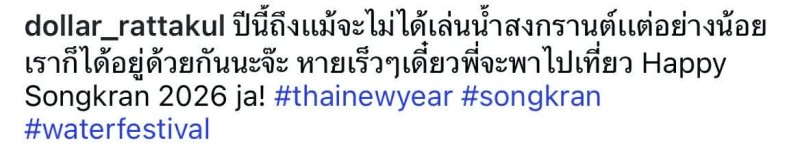 ด้าน เสธ.ดอลลาร์ ยังได้โพสต์ข้อความส่งกำลังใจอย่างอบอุ่น แม้ปีนี้ จะไม่ได้ออกไปฉลองสงกรานต์ แต่ขอเพียงได้อยู่เคียงข้างกัน พร้อมอวยพรให้หายดีโดยเร็ว