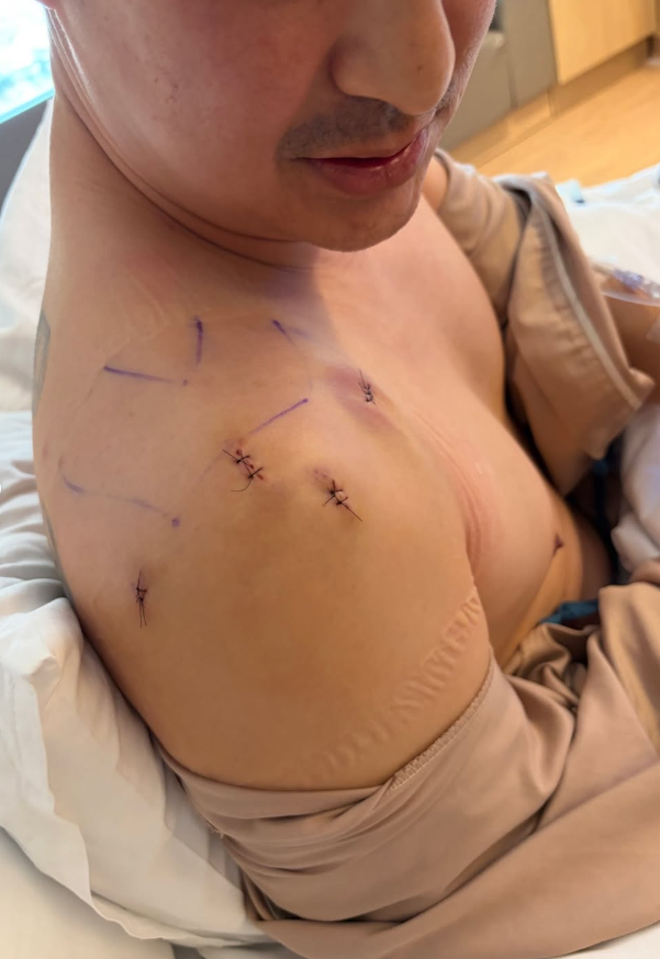การผ่าตัดของผมเรียกว่า การผ่าซ่อมแซมกล้ามเนื้อเอ็นหัวไหล่โดยการส่องกล้องครับ เคสของผม ภาพ MRI แสดงให้เห็นว่ากล้ามเนื้อไบเซปในส่วนบน ที่ยึดเกาะกระดูกหัวไหล่ มีการฉีกขาดไปมากถึง 80% เกือบจะขาดแล้ว ควรรับการผ่าตัดครับ การผ่าก็เป็นไปด้วยดีครับ คุณหมอได้ทำการตัดเอ็นบริเวณที่ฉีกจนเปื่อยยุ่ยออก จากนั้นก็ฝังน๊อตลงในกระดูก และเย็บเส้นเอ็นติดไว้กับตัวน๊อตครับ