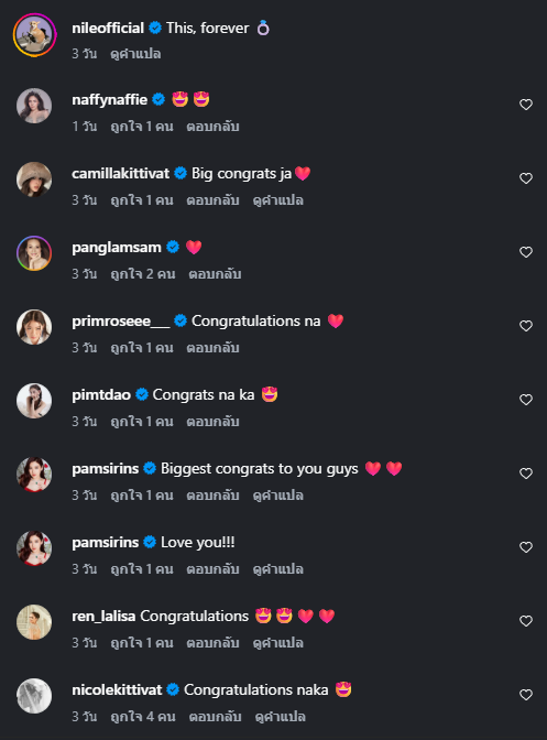 โดย ไนล ภาสิริ ได้โพสต์ภาพที่ถูกเซอร์ไพรส์คุกเข่าแต่งงาน พร้อมระบุแคปชั่นสั้นๆว่า This, forever ท่ามกลางคนในวงการบันเทิงเข้ามาแสดงความยินดีด้วยนวนมาก