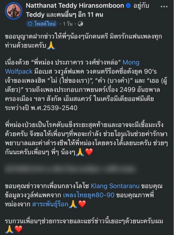 วันที่ 23 เม.ย. 69 เท็ดดี้ โลโซ (ณัฐฎ์ณัฐ หิรัญสมบูรณ์) ออกมาโพสต์เฟซบุ๊ก Natthanat Teddy Hiransomboon แจ้งข่าวอาการป่วยของ หม่อง ประภาคาร วงศ์ช่างหล่อ มือเบส วงวูล์ฟแพค (Wolfpack) วงร็อกชื่อดังในอดีต เจ้าของเพลงฮิตอย่าง ไม่ (ใช่ของเรา), คำ (บางคำ) และ เธอ (ผู้เดียว) รวมถึงผลงานเพลงประกอบภาพยนตร์เรื่อง “2499 อันธพาลครองเมือง”