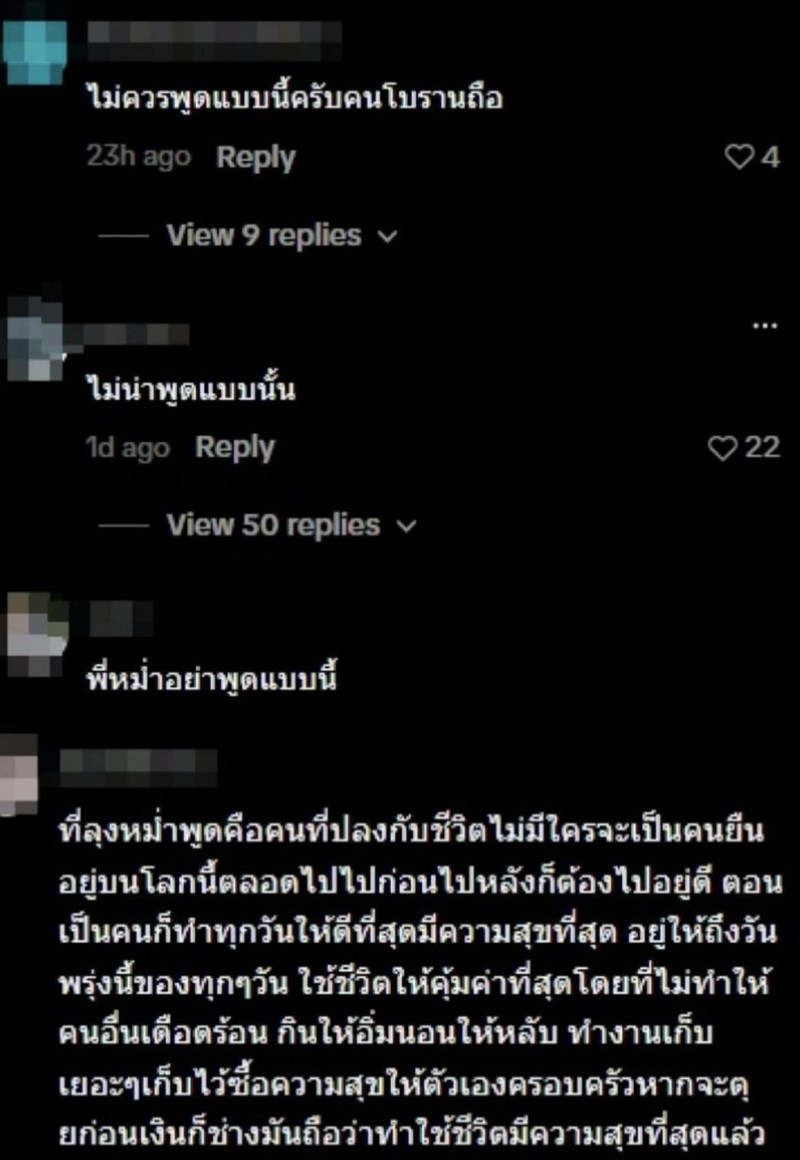ขณะเดียวกัน ก็มีอีกมุมหนึ่งที่เข้าใจเจตนา โดยมองว่า เป็นคำพูดตรงไปตรงมา สะท้อนสัจธรรมชีวิตที่ทุกคนต้องเผชิญในสักวันหนึ่ง