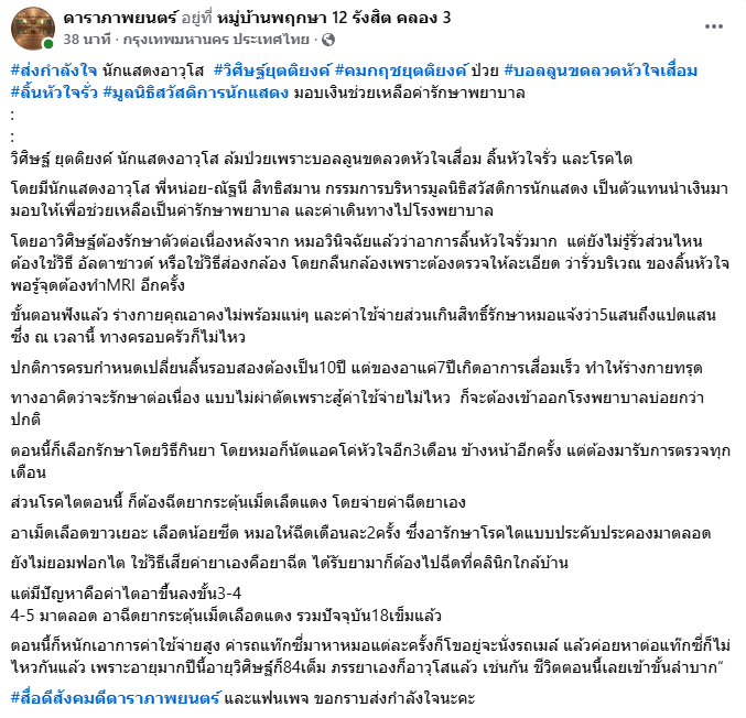 วันที่ 29 เม.ย. 69 ทางเพจ ดาราภาพยนตร์ ได้ออกมาเผยถึงอาการป่วยของ วิศิษฐ์ ยุตติยงค์ นักแสดงอาวุโส หลังป่วยเพราะบอลลูนขดลวดหัวใจเสื่อม ลิ้นหัวใจรั่ว และโรคไต