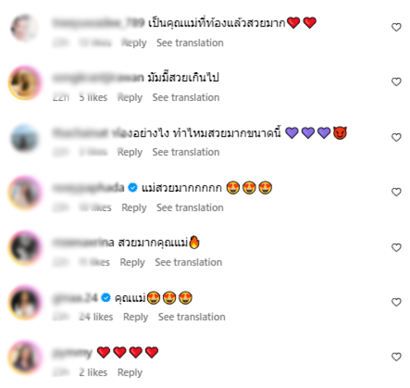 งานนี้ทำเอาเหล่าบรรดาชาวเน็ตเข้ามาแสดงความคิดเห็นอย่างมากมาย อาทิ เป็นคุณแม่ที่ท้องแล้วสวยมาก,แม่สวยมาก,มัมมี๊สวยเกินไป,สวยฉ่ำมากๆค่ะมี๊,คุมแม่สวยแซ่บมาก,สวยมากค่ะแม่,อย่างไง ทำไหมสวยขนาดนี้ เป็นต้น