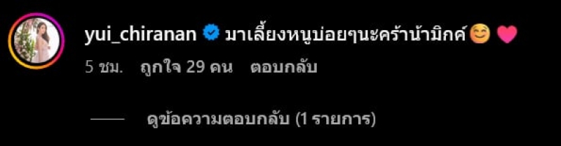 และล่าสุด พระเอก มิกค์ ทองระย้า ได้โพสต์รูปภาพคู่กับหลานสาว แคปชั่นว่า "ทำยังไงดีครับ ผมหลงหลานหนักมาก #ลูกพ่อธันนืแม่ยุ้ย" โดยมีคุณแม่ยุ้ยเข้ามาคอมเมนต์ในภาพว่า"มาเลี้ยงหนูบ่อยๆนะคร้าน้ามิกค์" และยังมีแฟนคลับที่เข้ามาแซวอย่างมากมาย อาทิ คุณพ่อตาแพนด้าหมดแล้ว,มีของตัวเองด่วนค่ะ,ละมุนไปหมดค่ะ น้ามิกค์,5555 ต้องมีลูกเองแล้ว แต่หาแม่ของลูกก่อนค่ะน้องชาย เป็นต้น