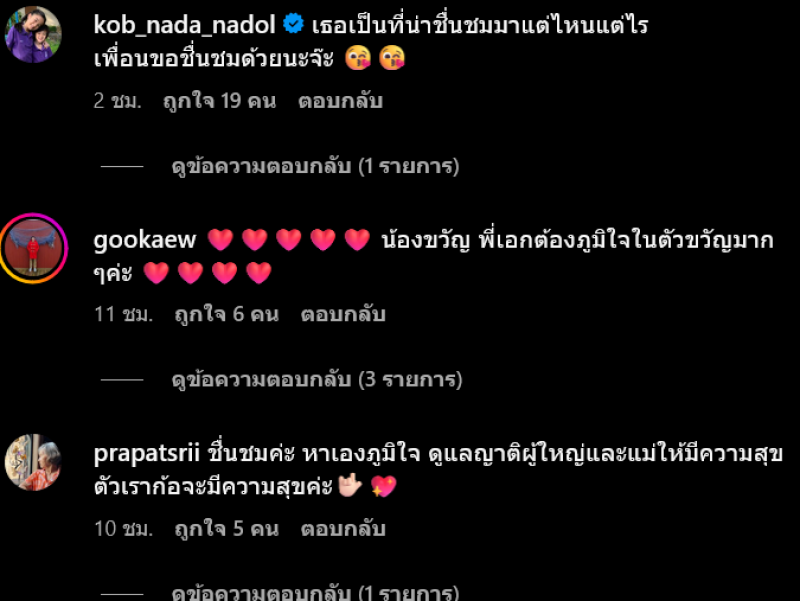 ซึ่งหลังจากที่ได้โพสต์ข้อความดังกล่าวออกไป ต่างมีชาวเน็ตและคนในวงการบันเทิงเข้ามาแสดงความคิดเห็นกันเป็นจำนวนมาก หนึ่งในนั้นคือ กบ สุวนันท์ ก็เข้ามาคอมเมนต์ชื่นชมเพื่อนว่า เธอเป็นคนที่น่าชื่นชมมาแต่ไหนแต่ไร เพื่อนขอชื่นชมด้วยนะจ๊ะ รวมทั้ง แนน ชลิตา , ยุ้ย ปัทมวรรณ ก็ส่งหัวใจให้รัวๆ เป็นต้น