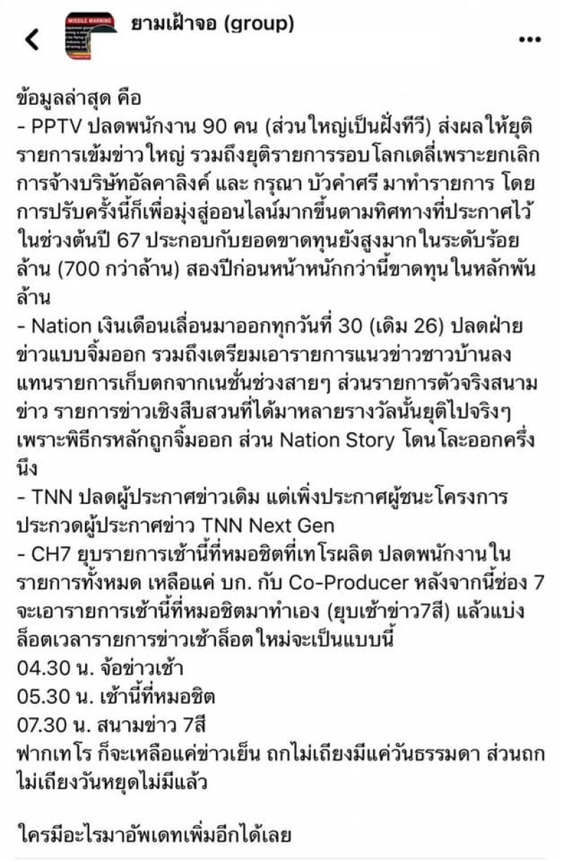 - Nation เงินเดือนเลื่อนมาออกทุกวันที่ 30 (เดิม 26) ปลดฝ่าย ข่าวแบบจิ้มออก รวมถึงเตรียมเอารายการแนวข่าวชาวบ้านลง
