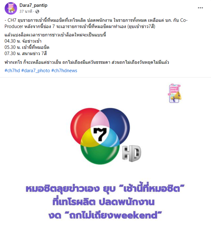 เรียกได้ว่า ไม่รู้เกิดอะไรขึ้น เมื่อมีเพจดัง อย่าง Dara7_pantip และ FB ยามเฝ้าจอ(group) ได้ออกมาเผยว่า CH7 ยุบรายการเช้านี้ที่หมอชิตที่เทโรผลิต ปลดพนักงาน ในรายการทั้งหมด เหลือแค่ บก. กับ Co-Producer หลังจากนี้ช่อง 7 จะเอารายการเช้านี้ที่หมอชิตมาทำเอง (ยุบเช้าข่าว7สี) แล้วแบ่งล็อตเวลารายการข่าวเช้าล็อตใหม่จะเป็นแบบนี้