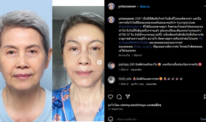 ซึ่งทาง โย ทัศน์วรรณ ได้ออกมาโพสต์รูปภาพหลังจากที่ได้ทำสวยมาว่า2567 เป็นปีที่ตัดสินใจทำในสิ่งที่ไม่เคยคิดจะทำ แต่เป็นเพราะมั่นใจในฝีมือของคุณหมอคิมฮยองจุน (Kim hyungiun) และที่ได้ยินและตามดูมา จึงตกลงใจยอมให้คุณหมอจุนทำให้ ถึงวันนี้ก็เดือนครึ่งกว่าๆ แล้วรูปแรกเปรียบเทียบระหว่างก่อนทำ ทำได้ 20 วัน ยังมีช้ำๆ บวมๆ อยู่ รูปที่ 2 หนึ่งเดือนกับอีกสิบวัน ขึ้นรับรางวัลนาฏราชด้วยความภูมิใจ สบายใจ ติดตามดูความคืบหน้าต่อไปนะคะ มีความสุขที่ตัดสินใจไม่ผิด ขอบคุณคุณหมอจุนมากๆ ค่ะ ทำเอาแฟนๆต่างคอมเมนต์ชื่นชมและแซวความสวยอย่างสนั่น อาทิ สวยมากค่ะแม่,สวยมากค่ะแม่โย ดูเด็กลงเลย,ว้าวดูสาวและสวยขึ้นมากๆๆค่ะ,สวย สาวขึ้นกำลังดีคับพี่,เป็นต้น