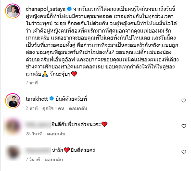 และทางอ๊อฟ ชนะพล เองก็ได้เผยภาพ และโพสต์พร้อมระบุข้อความว่า จากวันเเรกที่ได้ตกลงเป็นคนรู้ใจกันจนมาถึงวันนี้ ผู้หญิงคนนี้ก็ทำให้ผมมีความสุขมาตลอด เราอยู่ด้วยกันในทุกช่วงเวลา ไม่ว่าจะทุกข์ จะสุข ก็กอดกันไปด้วยกัน จนผู้หญิงคนนี้ทำให้ผมมั่นใจได้ว่า เค้าคือผู้หญิงคนที่สองที่ผมรักมากที่สุดนอกจากคุณเเม่ของผม รักมากนะครับ เเละอยากจะขอบคุณที่ไม่เคยทิ้งกันไปไหนเลย เเละวันนี้คงเป็นวันที่เรารอคอยทั้งคู่ คือก้าวเเรกที่จะมาเป็นครอบครัวกันจริงๆเเบบถูกต้อง ขอบคุณพี่อูมนะครับที่เข้าใจน้องทั้ง2 ขอบคุณเเม่ตั๊กเเม่ของน้องด้วยนะครับที่เอ็นดูอ๊อฟ เเละอยากจะขอบคุณเเม่นิดเเม่ของผมเองที่เคียงข้างความรักของเรา2คนมาตลอดเลย ขอบคุณทุกกำลังใจที่ให้ในคู่ของเราครับ รักนะจุ๊บๆ