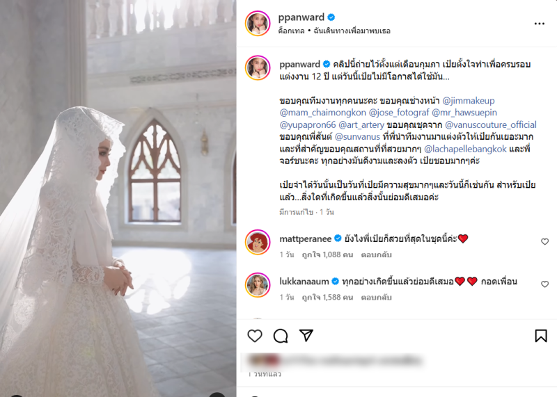 เป้ย : ก็ตั้งใจอยากจะเซอร์ไพรส์ค่ะ แต่เจอเซอร์ไพรส์กลับ (หัวเราะ) ไม่ได้อยากให้มันเศร้าเลย คือเราผ่านแล้ว และเราไม่ได้รู้สึกอะไรกับการโพสต์อันนี้ แค่ต้องการขอบคุณ แต่ถ้าจะโพสต์ขอบคุณในวาระโอกาสอื่น เราก็กลัวคนจะเข้าใจผิดว่าทำไมยังใส่ชุด หรืออะไรแบบนี้ ก็เลยใช้โอกาสฉลองมงคลสมรสแล้วกัน เป็นการขอบคุณสถานที่ เสื้อผ้า ทีมงานทุกคน ช่างแต่หน้าช่างทำผม ทุกคนไม่คิดค่าใช้จ่าย ด้วยใจที่มาช่วยเป้ย