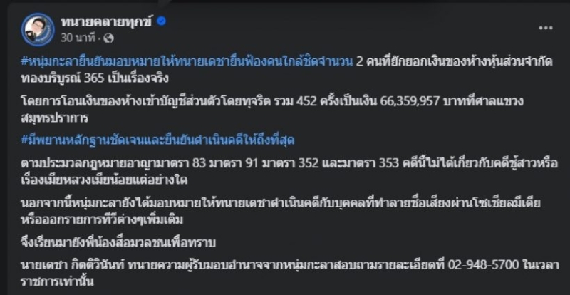 "หนุ่ม กะลา ยืนยันมอบหมายให้ ทนายเดชา ยื่นฟ้องคนใกล้ชิดจำนวน 2 คนที่ยักยอกเงินของห้างหุ้นส่วนจำกัดทองบริบูรณ์ 365 เป็นเรื่องจริง