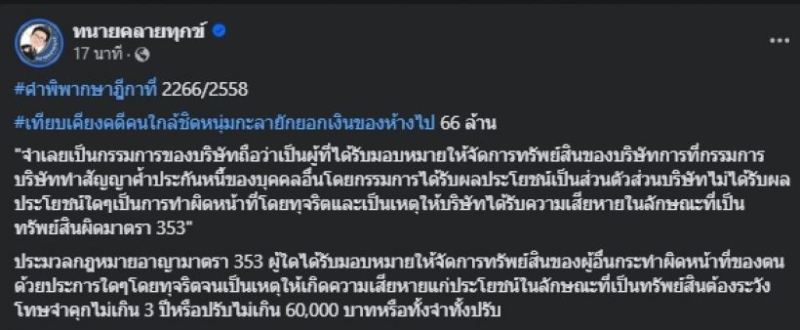 โดยการโอนเงินของห้างเข้าบัญชีส่วนตัวโดยทุจริต รวม 452 ครั้งเป็นเงิน 66,359,957 บาทที่ศาลแขวงสมุทรปราการ #มีพยานหลักฐานชัดเจนและยืนยันดำเนินคดีให้ถึงที่สุด ตามประมวลกฎหมายอาญามาตรา 83 มาตรา 91 มาตรา 352 และมาตรา 353 คดีนี้ไม่ได้เกี่ยวกับคดีชู้สาวหรือเรื่องเมียหลวงเมียน้อยแต่อย่างใด