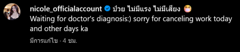 โดย นิโคล ได้โพสต์ภาพตัวเองขณะนอนพักผ่อนอยู่บนเตียงผู้ป่วย พร้อมแคปชั่นไว้ว่า "ป่วย ไม่มีแรง ไม่มีเสียง Waiting for doctor's diagnosis:) sorry for canceling work today and other days ka"