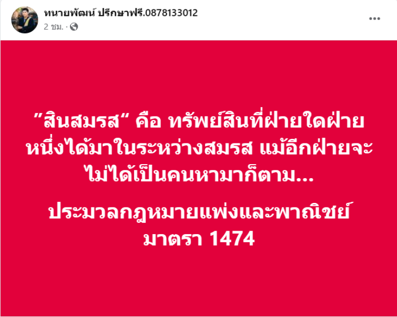 เเละอีกโพสต์คือ สินสมรส คือ ทรัพย์สินที่ฝ่ายใดฝ่ายหนึ่งได้มาในระหว่างสมรส แม้อีกฝ่ายจะไม่ได้เป็นคนหามาก็ตาม... ประมวลกฎหมายแพ่งและพาณิชย์มาตรา 1474