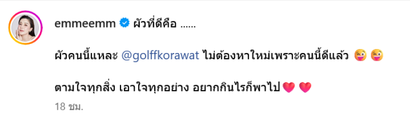 พร้อมแคปชั่นว่า "ผัวที่ดี....คือผัวคนนี้แหละ ไม่ต้องหาใหม่เพราะคนนี้ดีแล้ว ตามใจทุกอย่าง เอาใจทุกอย่าง อยากกินไรก็พาไป"