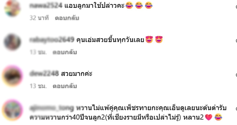 งานนี้ทำเอาแฟนๆแห่เข้ามาแสดงความคิดเห็นและสาดหัวใจเป็นจำนวนมาก อาทิ แอบลูกมาใช้ปล่าวคะ,คุนเอ่มสวยขึ้นทุกวันเลย,หวานไม่แพ้คู่คุณเพ็ชรทายกะคุณเอ็นดูเลยนะต้นตำรับความหวานกว่า40ปีจนลูก2(ที่เชียงรายมีหรือเปล่าไม่รู้) หลาน2 เป็นต้น