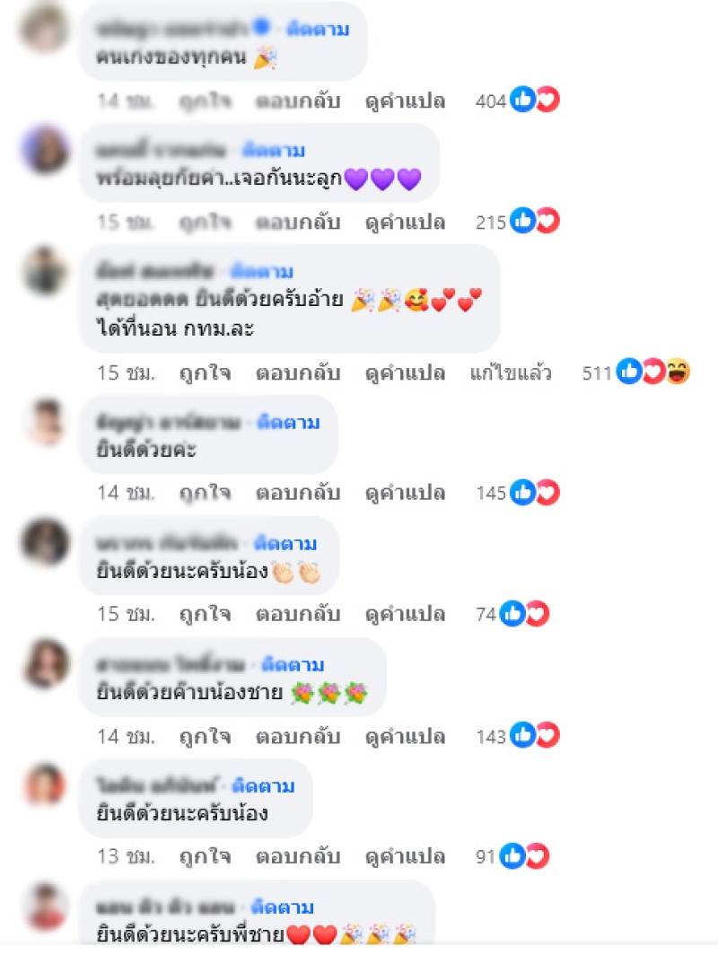 ท่ามกลางแฟนคลับที่เข้ามาคอมเมนต์แสดงความยินดี อาทิ คนเก่งของทุกคน,สุดยอดดด ยินดีด้วยครับอ้าย ได้ที่นอน กทม.ละ,ยินดีด้วยค่ะ,ยินดีด้วยนะครับน้อง เป็นต้น