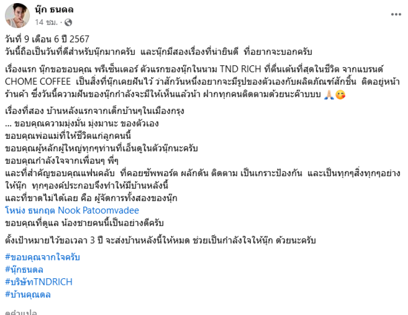 และล่าสุดเป็นเรื่องที่น่ายินดีมากเมื่อเขาได้มีบ้านหลังเเรกในกรุงเทพแล้วได้ออกโพสต์ขอบคุณทุกๆคน ที่คอยซัพพอร์ต ผลักดันและติดตามตนมาตลอด จนทำให้ตนได้มีบ้านหลังนี้ และตนนั้นก็ตั้งเป้าหมายไว้ว่าใช้เวลา 3 ปี จะผ่อนบ้านหลังนี้ให้หมด