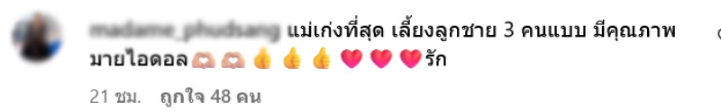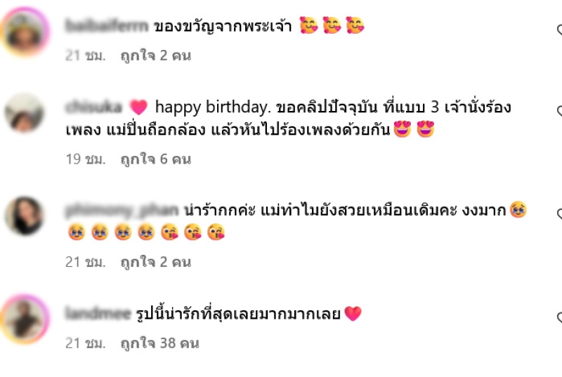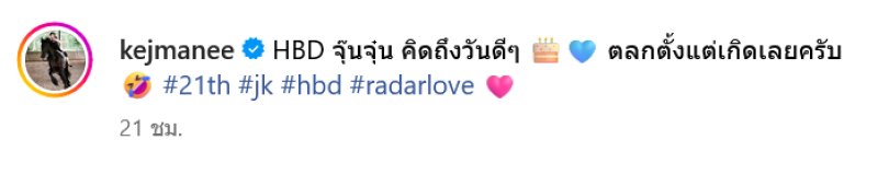 ปิ่น เก็จมณี ยังได้ระบุข้อความที่ออกมาจากใจไว้ว่า"HBD จุ๊นจุ๋น คิดถึงวันดีๆ ตลกตั้งแต่เกิดเลยครับ" ท่ามกลางเพื่อนสนิท คนในวงการเเละแฟนๆต่างเข้ามาคอมเมนต์กันอย่างมาก อาทิ ของขวัญจากพระเจ้า,น่ารัก,รูปนี้น่ารักที่สุดเลยมากมากเลย,แม่เก่งที่สุด เลี้ยงลูกชาย 3 คนแบบ มีคุณภาพ มายไอดอล เป็นต้น