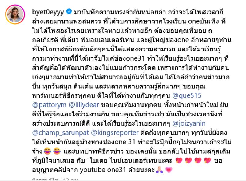 ขอบคุณพาร์ทเนอร์พิธีกรทุกคน ดีใจที่ได้ทำงานกับทุุกๆคน ขอบคุณทีมงานทุกคน ทั้งหน้าเก่าหน้าใหม่ ยินดีที่ได้รู้จักและได้ร่วมงานกัน ขอบคุณทีมข่าวเช้า มันเป็นช่วงเวลานึงที่สร้างประสบการณ์ดีดี และได้เรียนรู้อะไรเยอะมากๆ คิดถึงทุกคนมากๆ ทุกวันนี่ยังคงได้เห็นหน้ากันอยู่บ้างทางช่องone 31 ทำอะไรปุ๊กปิ๊กๆไปจนกว่าเค้าจะไม่จ้างและบทบาทพิธีกรข่าว ของเตยนั้น ขอกลับไปใช้นามสกุลเดิมที่ภูมิใจมาเสมอ กับ ใบเตย ไนน์เอนเตอร์เทนนะคะ ขออนุญาตคลิปจาก youtube one31 ด้วยนะคะ