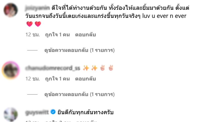 หลังจากที่เธอได้โพสต์ไปต่างมีคนแห่คอมเมนต์มากมาย อาทิ ดีใจที่ได้ทำงานกับเตยน้าาาา เทอเก่งมากๆ ด้นสดเก่ง จำสคริปแม่น อัดรายการด้วยทีไรเสร็จไวตลอดเลย,ดีใจที่ได้ทำงานด้วยกัน ทั้งร้องไห้และยิ้มมาด้วยกัน ตั้งแต่วันแรกจนถึงวันนี้เตยเก่งและแกร่งขึ้นทุกวันจริงๆ luv u ever n ever,ยินดีกับทุกเส้นทางครับ, น้องใบเตยคนเก่งหญิงแกร่ง ขอให้ทุกเส้นทางหลังจากนี้มีแต่ความสำเร็จรออยู่นะค้าบ เป็นต้น