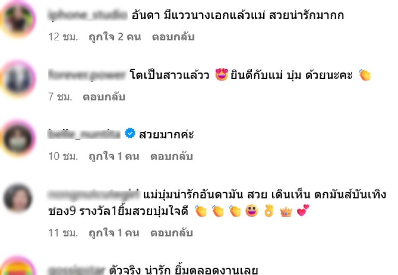 หลังจากที่ได้โพสต์ภาพนี้ออกไปทำเอาแฟนๆต่างเข้ามาคอมเมนต์อย่างล้นหลาม อาทิ อันดา มีแววนางเอกแล้วแม่ สวยน่ารักมาก,โตเป็นสาวแล้วว ยินดีกับแม่ บุ๋ม ด้วยนะคะ,สวยมากค่ะ,แม่บุ๋มน่ารักอันดามัน สวย เดินเห็น ตกมันส์บันเทิง ชอง9 รางวัล1ยิ้มสวยบุ๋มใจดี