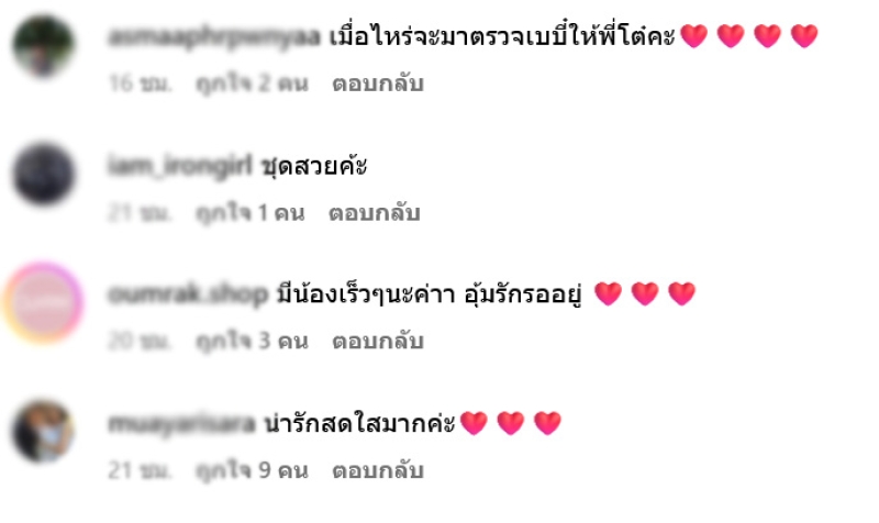 และทางด้านแฟนๆก็ได้แห่เข้ามาคอมเมนต์ถามถึงทายาทตัวน้อย อาทิ น่ารักมากเลยค่ะแล้วจะมาฝากเมื่อไหร่คะ,พี่ไบร์ทสดใสมากกก,เมื่อไหร่จะมาตรวจเบบี๋ให้พี่โต๋คะ,มีน้องเร็วๆนะค่าา อุ้มรักรออยู่ เป็นต้น