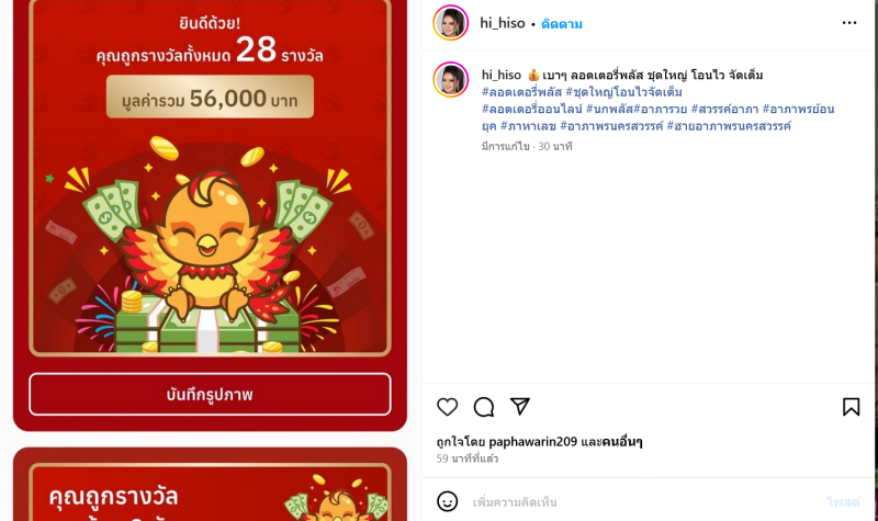 ซึ่งหลังจากที่สำนักงานสลากกินแบ่งรัฐบาล ประกาศผลรางวัลงวดวันที่ 16 มิถุนายน 2567 ต่างมีเศรษฐีใหม่เกิดขึ้น ทางด้านลูกทุ่งดังดวงเฮงอย่าง ฮาย อาภาพร ก็โพสต์หลังหวยออก โดย ฮาย ได้แคปผลถูกรางวัลทั้งหมด 28รางวัล มูลค่ารวม 56,000 บาท พร้อมระบุข้อความว่า เบาๆ อาภารวย สวรรค์อาภา อาภาพรย้อนยุค ภาหาเลข อาภาพรนครสวรรค์ ฮายอาภาพรนครสวรรค์