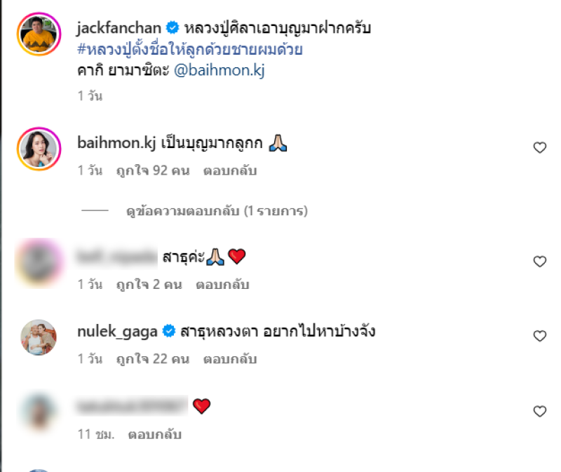 ล่าสุด แจ็ดได้ออกมาเผยชื่อใหม่ของลูกโดยมีหลวงปู่ตั้งให้ผ่านทางอินสตาแกรม พร้อมระบุข้อความว่า หลวงปู่ศิลาเอาบุญมาฝากครับ #หลวงปู่ตั้งชื่อให้ลูกด้วยชายผมด้วย คากิ ยามาซิตะ @baihmon.kj โดยทางใบหม่อนเอง ก็ได้มาคอมเมนต์ใต้โพสต์ว่า เป็นบุญมากลูกก