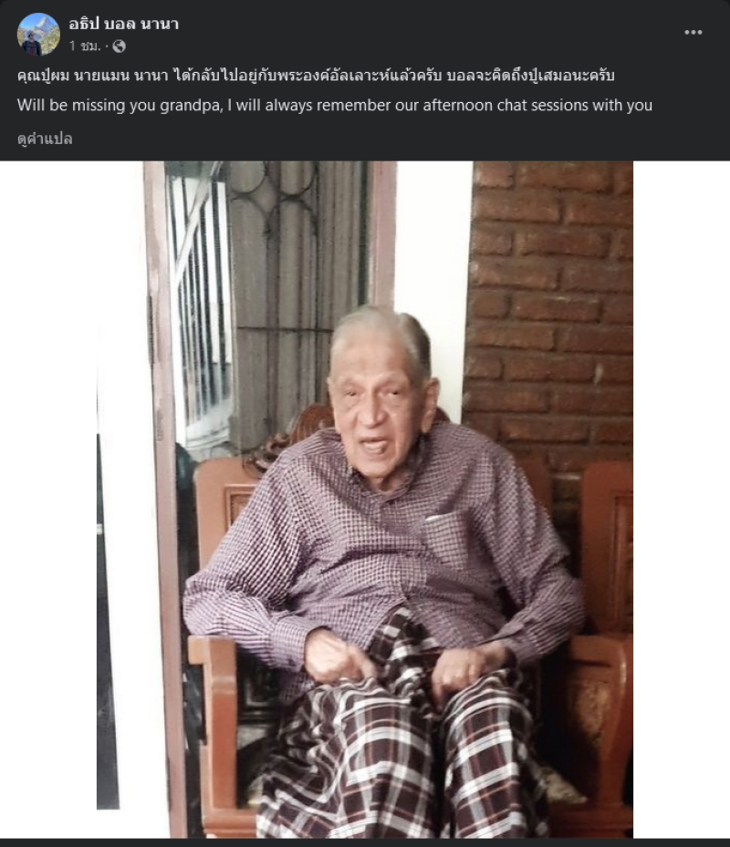 กลายเป็นข่าวเศร้า เมื่อล่าสุดวันที่ 18 มิ.ย.67 ศิลปินชื่อดังอย่าง อธิป บอล นานา ได้โพสต์เฟซบุ๊คแจ้งข่าวเศร้า พร้อมเผยภาพคุณปู่ ระบุข้อความว่า "คุณปู่ผม นายแมน นานา ได้กลับไปอยู่กับพระองค์อัลเลาะห์แล้วครับ บอลจะคิดถึงปู่เสมอนะครับ Will be missing you grandpa, I will always remember our afternoon chat sessions with you" งานนี้ทำเอาเหล่าบรรดาแฟนๆและคนในวงการแห่คอมเมนต์ให้กำลังใจกันอย่างมากมาย