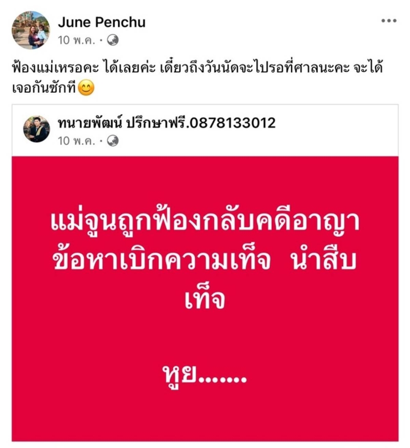 เป็นที่ถูกจับตาของชาวเน็ตกันอย่างต่อเนื่องสำหรับคดีความของ จูน เพ็ญชุลี ภรรยา หนุ่ม กะลา และ CEOจ๊ะโอ๋ คู่กรณี ซึ่งคู่กรณีที่ถูกกล่าวว่าเป็นมือที่สาม ได้เดินทางพร้อมกับทนายเดชา ขึ้นศาลลพบุรี เตรียมเดินหน้าฟ้องแม่จูนในข้อหาเบิกความเท็จ