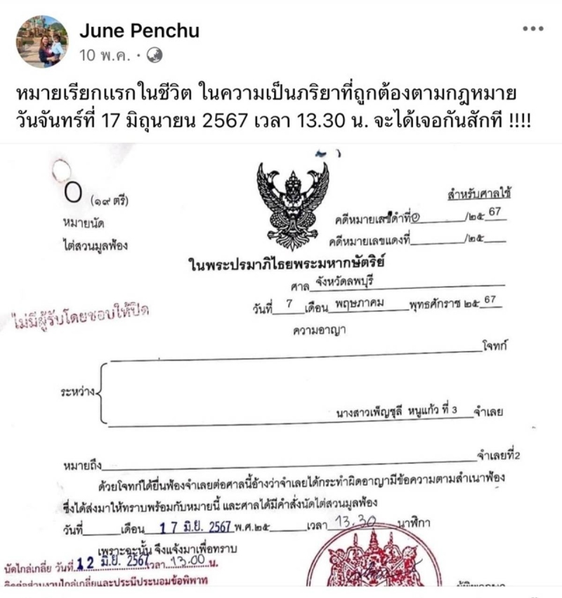 เมื่อวันที่ 10 พ.ค.จูน เพ็ญชุลี ภรรยา หนุ่ม กะลา ได้โพสต์ว่า หมายเรียกแรกในชีวิต ในความเป็นภริยาที่ถูกต้องตามกฎหมาย วันจันทร์ที่ 17 มิถุนายน 2567 จะได้เจอกันสักที