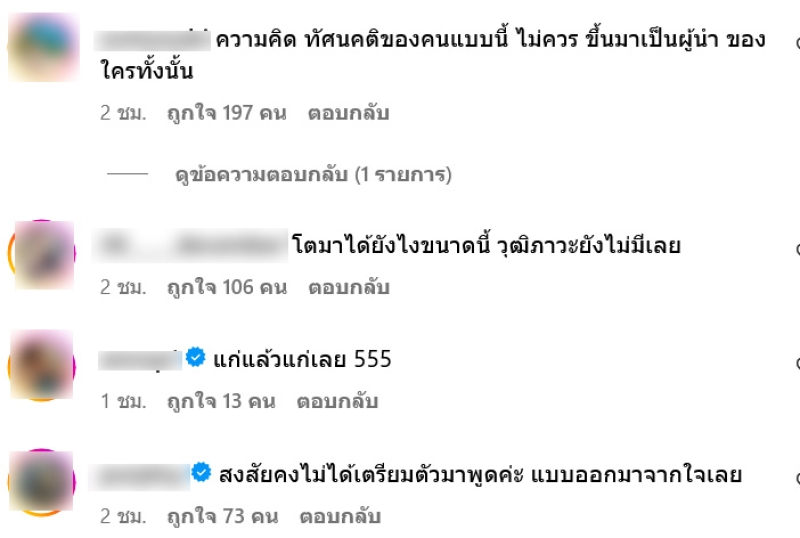 ซึ่งหลังจากที่ บุ๋ม ได้แชร์โพสต์ไปต่างมีแฟนๆแห่เข้ามาคอมเมนต์เป็นเสียงเดียวกันมากมาย อาทิ ความคิด ทัศนคติของคนแบบนี้ ไม่ควร ขึ้นมาเป็นผู้นำ ของใครทั้งนั้น,โตมาได้ยังไงขนาดนี้ วุฒิภาวะยังไม่มีเลย,สงสัยคงไม่ได้เตรียมตัวมาพูดค่ะ แบบออกมาจากใจเลย เป็นต้น