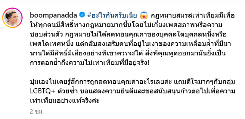 โดยเขียนข้อความว่า "อะไรกันครับเนี่ย กฎหมายสมรสเท่าเทียมมีเพื่อให้ทุกคนมีสิทธิ์ทางกฎหมายมากขึ้นโดยไม่เกี่ยงเพศสภาพหรือความชอบส่วนตัว กฎหมายไม่ได้ลดทอนคุณค่าของบุคคลใดบุคคลหนึ่งหรือเพศใดเพศหนึ่ง แต่กลับส่งเสริมคนที่อยู่ในเงาของความเหลื่อมล้ำที่มีมานานได้มีสิทธิ์มีเสียงอย่างที่เขาควรจะได้ สิ่งที่คุณพูดออกมามันยิ่งเป็นการตอกย้ำถึงความไม่เท่าเทียมที่มีอยู่จริง!