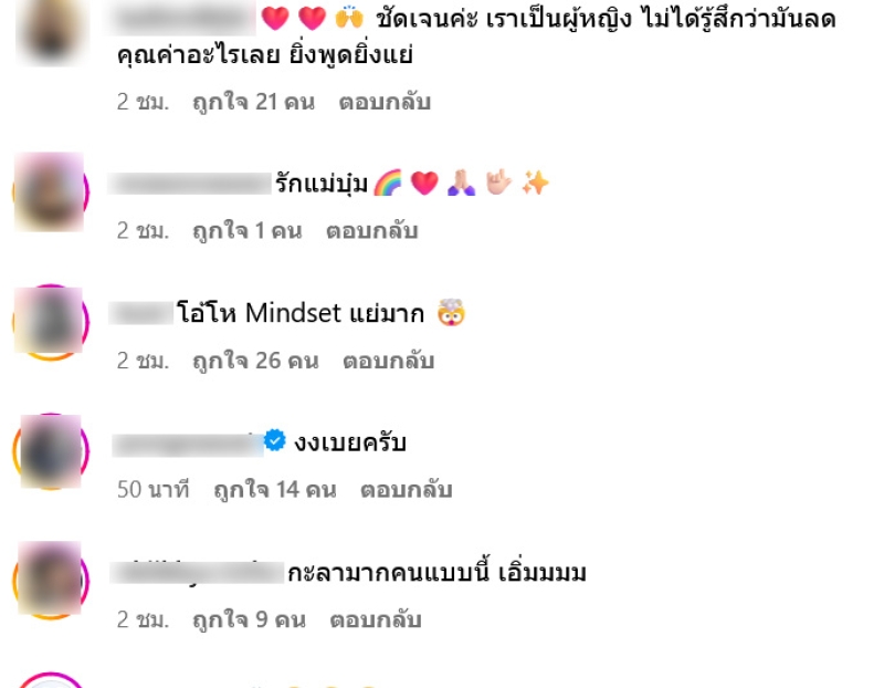 บุ๋มเองไม่เคยรู้สึกการถูกลดทอนคุณค่าอะไรเลยค่ะ แถมดีใจมากๆกับกลุ่ม LGBTQ+ ด้วยซ้ำ ขอแสดงความยินดีและขอสนับสนุนก้าวต่อไปเพื่อความเท่าเทียมอย่างแท้จริงค่ะ"