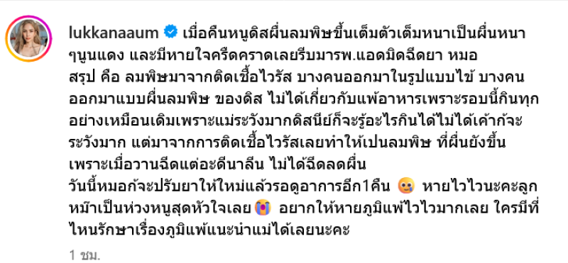 เรียกได้ว่าเป็นนักแสดงสาวหม้ายลูก1สำหรับ อุ้ม ลักขณา ที่ล่าสุดลูกสาวสุดที่รัก น้องดิสนีย์ ป่วยเข้าโรงพยาบาล โดย อุ้ม ได้เล่าเรื่องราวผ่านทางอินสตาแกรมว่า เมื่อคืน หนูดิส ผื่นลมพิษขึ้นเต็มตัวเต็มหน้าเป็นผื่นหนาๆนูนแดง และมีหายใจครืดคราดเลยรีบมารพ.แอดมิดฉีดยา หมอ สรุป คือ ลมพิษมาจากติดเชื้อไวรัส บางคนออกมาในรูปแบบไข้ บางคนออกมาแบบผื่นลมพิษ ของดิส ไม่ได้เกี่ยวกับแพ้อาหารเพราะรอบนี้กินทุกอย่างเหมือนเดิมเพราะแม่ระวังมาก ดิสนีย์ ก็จะรู้อะไรกินได้ไม่ได้เค้าก็จะระวังมาก