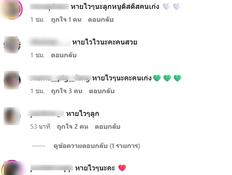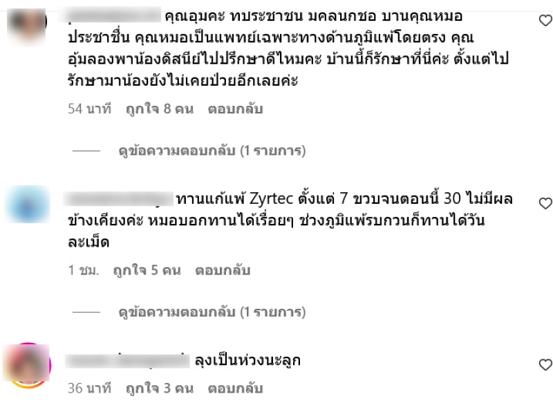 หลังจากที่ อุ้ม ได้โพสต์เรื่องราวไปต่างมีแฟนๆและชาวเน็ตให้คำแนะนำและขอให้น้องหายไวๆ อาทิ ทานแก้แพ้ Zyrtec ตั้งแต่ 7 ขวบจนตอนนี้ 30 ไม่มีผลข้างเคียงค่ะ หมอบอกทานได้เรื่อยๆ ช่วงภูมิแพ้รบกวนก็ทานได้วันละเม็ด,หายไวๆนะคะคนเก่ง,หายไวไวนะคะคนสวย เป็นต้น