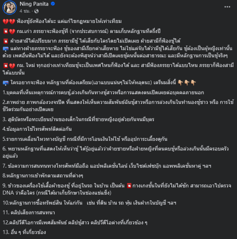 จากประเด็นที่ได้มีกระแสร้อนแรงในช่วงที่ผ่านมาสำหรับนักแสดงสาวอย่าง หนิง ปณิตา กรณีฟ้องเรียกค่าเสียหายจากชู้ไม่ได้ ซึ่งทำให้ชาวเน็ตหลายคนตั้งข้อสงสัยและวิพากษ์วิจารณ์กันอย่างเดือด ล่าสุด หนิง ได้ออกมาโพสต์เฟซบุ๊คถึงประเด็นที่เกิดขึ้นว่า "ฟ้องชู้ยังฟ้องได้นะ แค่แก้ไขกฏหมายให้เท่าเทียม กม.เก่า ภรรยาจะฟ้องชู้ที (จากประสบการณ์) ตามเก็บหลักฐานทีครึ่งปี ฝ่ายสามีได้เปรียบมาก ภรรยามีชู้ ได้เสียกับใครโดยไม่เปิดเผย ฝ่ายสามีก็ฟ้องชู้ได้