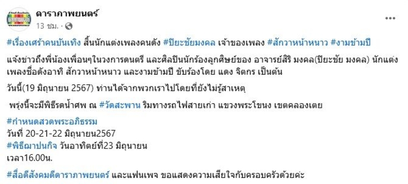 แจ้งข่าวถึงพี่น้องเพื่อนๆในวงการดนตรี และศิลปินนักร้องลูกศิษย์ของ อาจารย์สิริ มงคล(ปิยะชัย มงคล) นักแต่งเพลงชื่อดัง อาทิ สักวาหน้าหนาว และ งามข้ามปี ขับร้องโดย แดง จิตกร เป็นต้น