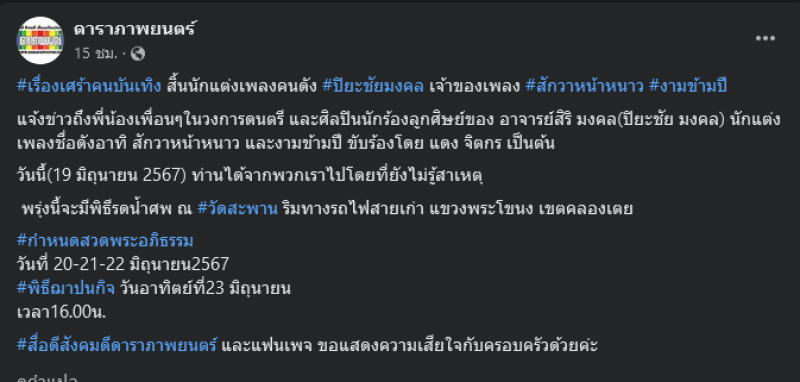 วันนี้(19 มิถุนายน 2567) ท่านได้จากพวกเราไปโดยที่ยังไม่รู้สาเหตุ พรุ่งนี้จะมีพิธีรดน้ำศพ ณ วัดสะพาน ริมทางรถไฟสายเก่า แขวงพระโขนง เขตคลองเตย กำหนดสวดพระอภิธรรม วันที่ 20-21-22 มิถุนายน2567 พิธีฌาปนกิจ วันอาทิตย์ที่23 มิถุนายน เวลา16.00น." ชาวเน็ตต่างเข้ามาคอมเมนต์แสดงความเสียใจกันอย่างมากมาย