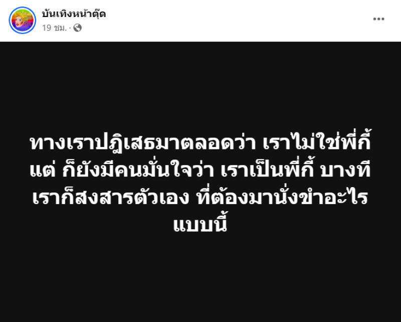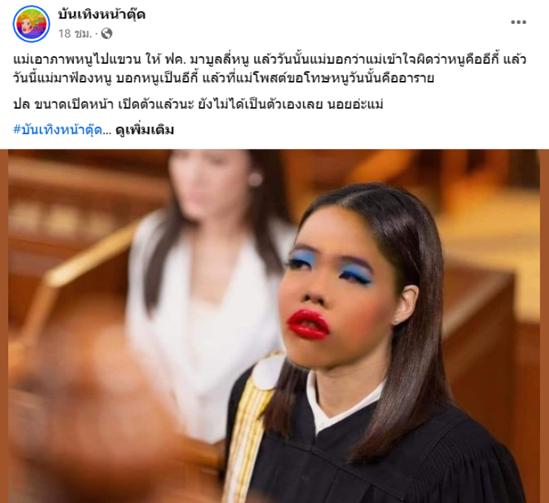 และทางเพจบันเทิงหน้าตุ๊ด เอง ก็ได้โพสต์รัวๆว่า แม่เอาภาพหนูไปแขวน ให้ ฟค. มาบูลลี่หนู แล้ววันนั้นแม่บอกว่าแม่เข้าใจผิดว่าหนูคืออีกี้ แล้ววันนี้แม่มาฟ้องหนู บอกหนูเป็นอีกี้ แล้วที่แม่โพสต์ขอโทษหนูวันนั้นคืออาราย ปล ขนาดเปิดหน้า เปิดตัวแล้วนะ ยังไม่ได้เป็นตัวเองเลย นอยอ่ะแม่