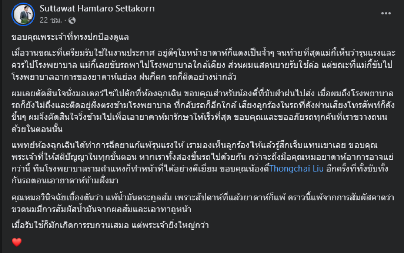 ซึ่งทางด้าน เต๊ะ ได้โพสต์ว่า ขอบคุณพระเจ้าที่ทรงปกป้องดูแล เมื่อวานขณะที่เตรียมรับใช้ในงานประกาศ อยู่ดีๆใบหน้ายาดาห์ก็แดงเป็นจ้ำๆ จนท้ายที่สุดแม่กี้เห็นว่ารุนแรงและควรไปโรงพยาบาล แม่กี้เลยขับรถพาไปโรงพยาบาลใกล้เคียง ส่วนผมแสตนบายรับใช้ต่อ แต่ขณะที่แม่กี้ขับไปโรงพยาบาลอาการของยาดาห์แย่ลง ฝนก็ตก รถก็ติดอย่างน่ากลัว ผมเลยตัดสินใจนั่งมอเตอร์ไซไปดักที่ห้องฉุกเฉิน ขอบคุณสำหรับน้องตี๋ที่ขับฝ่าฝนไปส่ง เมื่อผมถึงโรงพยาบาล รถก็ยังไม่ถึงและติดอยู่ฝั่งตรงข้ามโรงพยาบาล ที่กลับรถก็อีกใกล้ เสียงลูกร้องในรถที่ดังผ่านเสียงโทรศัพท์ก็ดังขึ้นๆ ผมจึงตัดสินใจวิ่งข้ามไปเพื่อเอายาดาห์มารักษาให้เร็วที่สุด ขอบคุณและขออภัยรถทุกคันที่เราขวางถนนด้วยในตอนนั้น