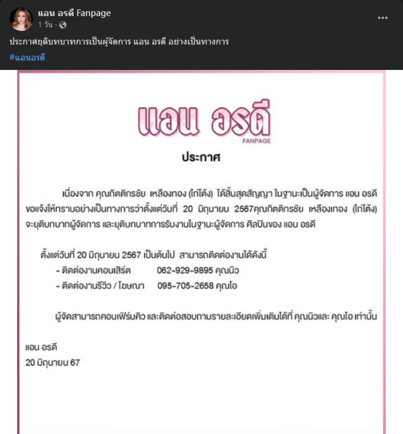 ล่าสุดทางด้าน แอนอรดี ได้ออกมาโพสต์ประกาศอย่างชัดเจนว่า เนื่องจาก คุณกิตติกรชัย เหลืองทอง (ไก่โต้ง) ได้สิ้นสุดสัญญา ในฐานะเป็นผู้จัดการ แอน อรดีขอแจ้งให้ทราบอย่างเป็นทางการว่าตั้งแต่วันที่ 20 มิถุนายน 2567คุณกิตติกรชัย เหลืองเทอง (ไก่โต้ง)จะยุติบทบาทผู้จัดการ และยุติบทบาทการรับงานในฐานะผู้จัดการ ศิลปินของ แอน อรดี