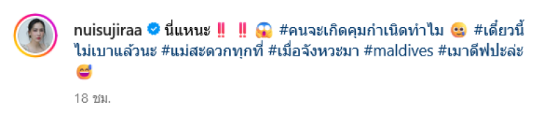 ทางด้าน นุ้ย ได้โพสต์และเขียนแคปชั่นว่า "นี่แหนะ คนจะเกิดคุมกำเนิดทำไม เดี๋ยวนี้ไม่เบาแล้วนะ แม่สะดวกทุกที่ เมื่อจังหวะมา maldives เมาดีฟปะล่ะ